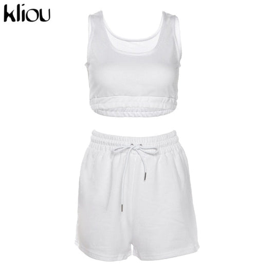 Kliou Casual Solid Sportswear Two Piece Sets Women 2021 Crop Top And Drawstring Shorts Matching Set Summer Athleisure Outfits